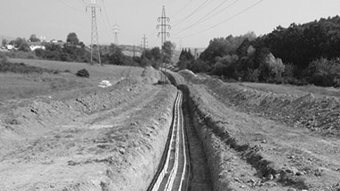 Lomnice – pokládka PE potrubí a kabelu NN. PE potrubí DN 160mm bylo instalováno v gravitačním spádu a poloha elektronicky dokumentována. Celková délka 6km.